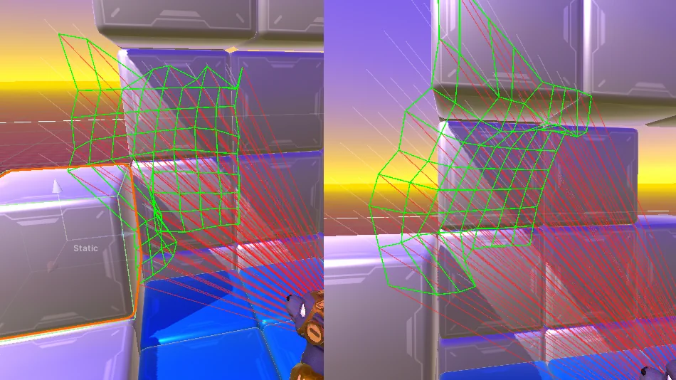 A notable feature in the game mode was the camera. It creates a some sort of mesh where the camera has a valid position. These points will then be interpolated to create a smooth transition when colliding into objects. This way there are no sudden jumps or cuts when playing the game and bumping into blocks.